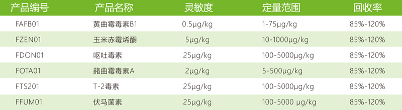 南京微測生物FD系列真菌毒素?zé)晒舛靠焖贆z測儀及檢測卡,可快速、準(zhǔn)確、定量的測定糧油谷物(小麥、玉米、大米等谷物及花生油、玉米油等植物油)、飼料原料及飼料成品中多種真菌毒素,包括黃曲霉毒素、玉米赤霉烯酮、嘔吐毒素、赭曲霉毒素、伏馬菌素、T-2毒素等。